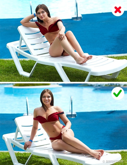 Khắc phục: Dáng nửa nằm với một chân ở phía trước hoàn toàn thể hiện được các điểm nhấn, các đường nét thanh lịch của cơ thể.