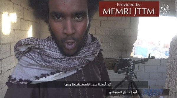 Báo IB Times cho biết, trong video mới xuất hiện trên mạng, phiến quân IS Abu Ishaq al-Somali cầm một con dao lớn và đứng cạnh một khẩu súng máy kê sát cửa sổ ở một nơi không rõ địa danh.
