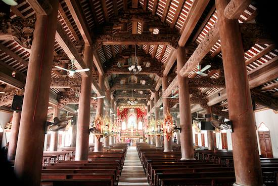 Nhà thờ dài 50 m, rộng 16m thiết kế 11 gian bằng tường gạch, lợp ngói vảy rộng. Bên trong nhà thờ nội thất đều được làm bằng gỗ.