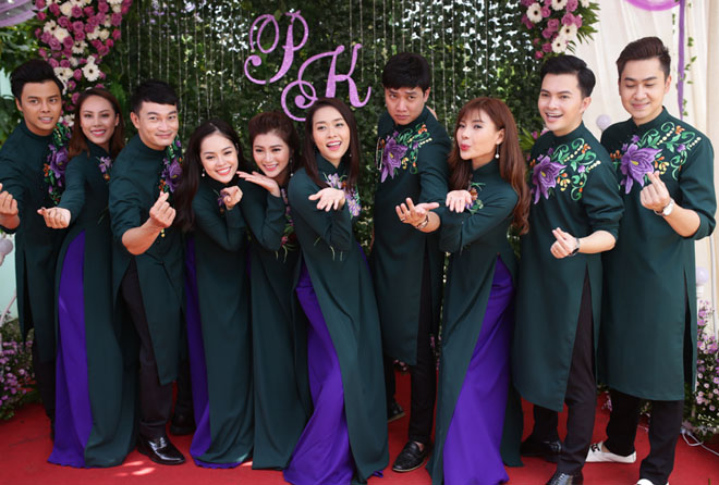 Dàn phù rể, phù dâu bưng mâm quả có nhiều đồng nghiệp thân thiết với Lê Phương như ca sĩ Nam Cường, diễn viên Quốc Thái, Trung Dũng, Diệp Bảo Ngọc, Dương Cẩm Lynh, Thanh Trúc,...