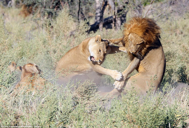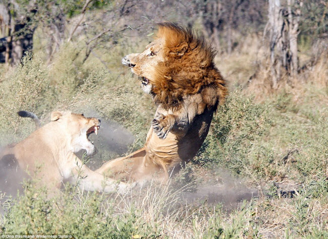 Con sư tử đực bị các thành viên trong đàn tấn công ngã xuống đất, buộc phải bỏ chạy để bảo toàn tính mạng. “Những con cái hài lòng với hình phạt của chúng dành cho kẻ vô tổ chức”, Basimane nói.