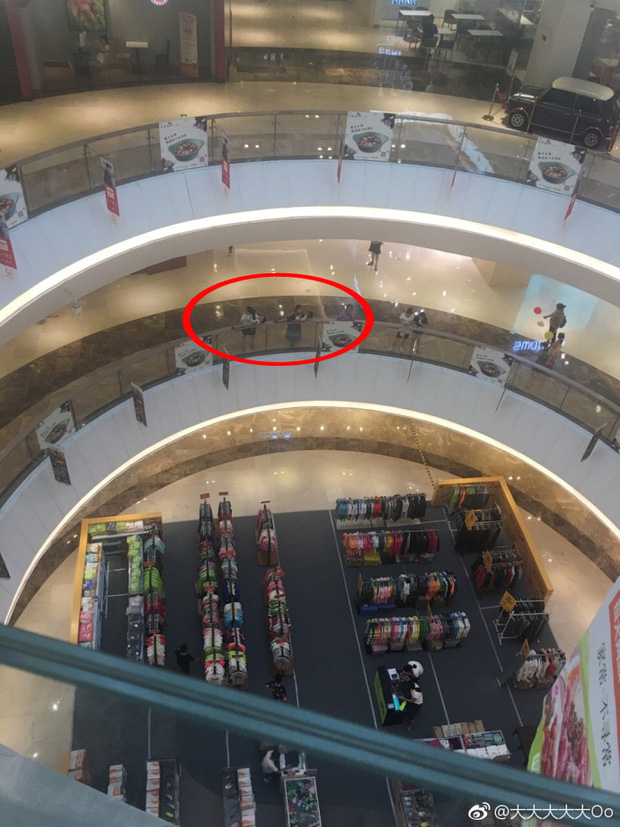 Họ hồn nhiên đặt con lên tay vịn của lan can rồi đứng chuyện trò, nhìn ngắm khung cảnh xung quanh. Mặc dù 2 bà mẹ vẫn dùng tay ôm con, nhưng nhìn 2 đứa bé bất đắc dĩ bị đặt vào tình trạng “ngàn cân treo sợi tóc”, nhiều người có mặt tại trung tâm thương mại đã bị sốc.