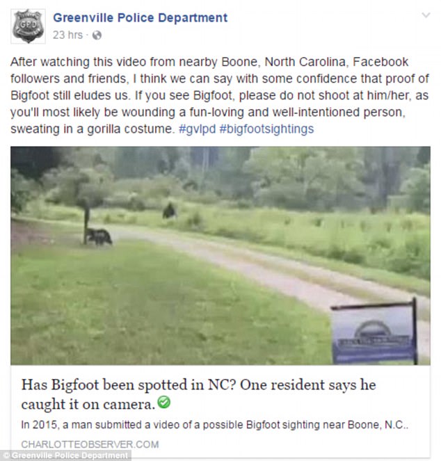 “Nếu bạn nhìn thấy nhìn thấy quái vật Bigfoot, thì đừng bắn nó. Bởi vì có trường hợp bạn sẽ làm bị thương người hóa trang thành khỉ đột nhằm mục đích giải giải trí”, cảnh sát Greenville cảnh báo trên trang Facebook.