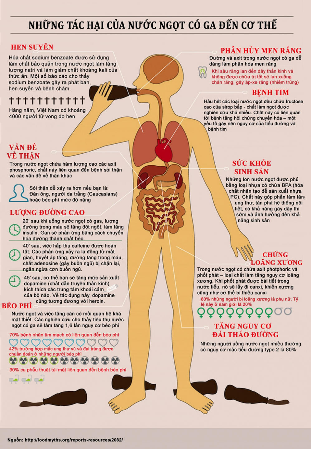 Đây là nguyên nhân gây ra nhiều bệnh. Đầu tiên là bệnh béo phì. Theo thống kê, tiêu thụ 1 lon nước ngọt có ga mỗi ngày có thể làm tăng 6.75kg cân nặng trong một năm.