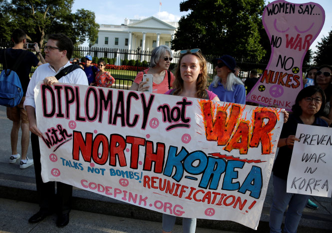 Biểu tình kêu gọi đàm phán hòa bình với Bình Nhưỡng trước Nhà Trắng ở Washington - Ảnh: REUTERS