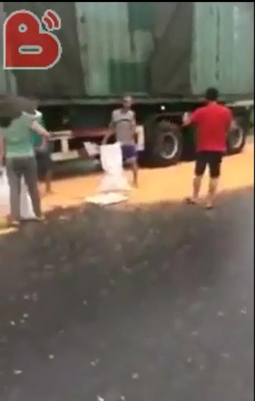Ngô rơi phủ kín mặt đường một đoạn dài, từ một xe container bị bung cửa. Thấy bị hôi của, tài xế container chạy tới xin người dân đừng lấy ngô nhưng họ vẫn mặc kệ.