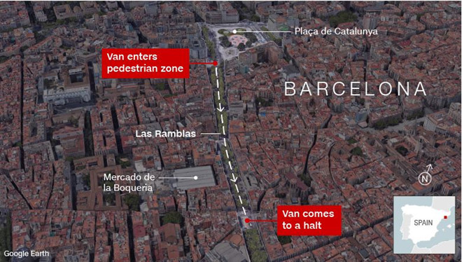 Cuộc tấn công nhằm vào khu vực mua sắm, du lịch lịch sử nằm giữa trung tâm thành phố vào mùa cao điểm du lịch của Tây Ban Nha. Cảnh sát xác định đây là cuộc tấn công khủng bố và đã kích hoạt các quy trình ứng phó. Tổ chức Nhà nước Hồi giáo tự xưng (IS) đã nhận trách nhiệm vụ khủng bố này.