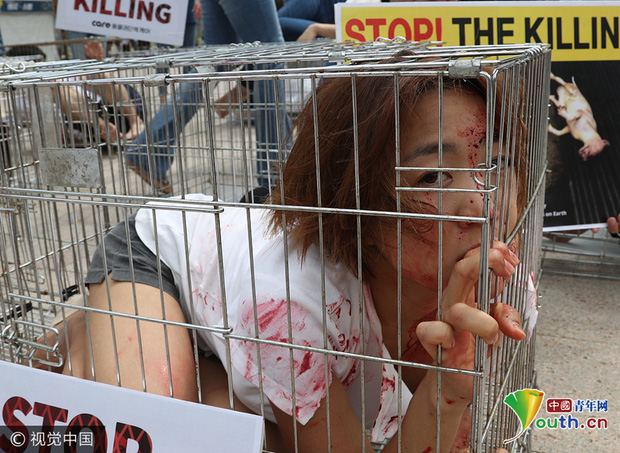 Bên cạnh những cô gái trong lồng sắt là rất nhiều người yêu động vật khác cũng góp mặt ủng hộ hoạt động này. Toàn thân họ đầy máu giả, trên tay là tấm biểu ngữ phản đối việc giết hại loài chó - loài động vật - thú nuôi - người bạn trung thành, gắn bó nhất với con người.