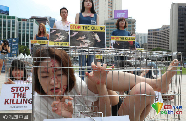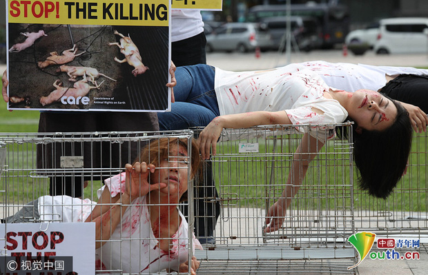 Vietbf.com - Dư luận chú ý bởi hành động gây sốc của nhiều thiếu nữ Hàn Quốc đã chui vào lồng sắt chật chội ngồi co ro và bôi mực đỏ giống máu để phản đối những người ăn thịt chó, vì nhiều doanh nghiệp đã biến việc giết chó và chế biến thịt chó thành 1 mô hình sản xuất chuyên nghiệp với quy mô lớn.