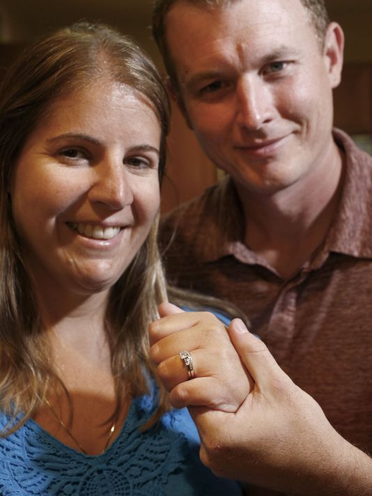Margaret Mussel và chồng, Justin, chụp ảnh cùng chiếc nhẫn đính hôn vừa tìm thấy