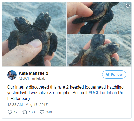 "Thực tập sinh của chúng tôi đã phát hiện con rùa hai đầu hiếm có này ngày hôm qua. Nó thật sống động và tràn đầy sức sống" - Mansfield đăng trên Tweeter.