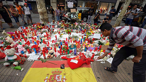 Một người đàn ông đặt nến cầu nguyện cho các nạn nhân trong vụ khủng bố bằng xe tải trên đại lô Las Ramblas, Barcelona, Tây Ban Nha. Ảnh: AFP.
