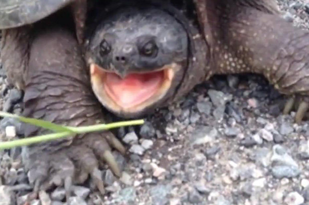 Thật kinh hão khi chứng kiến cảnh này. Nhìn thấy con rùa khổng lồ đi lạc trên đường, một người đàn ông tiến lại gần nó để "làm thân" với một ngọn cỏ trên tay. Thật bất ngờ, con rùa khủng thỏ cổ ngoạm ngay lấy bàn tay đến chảy máu.