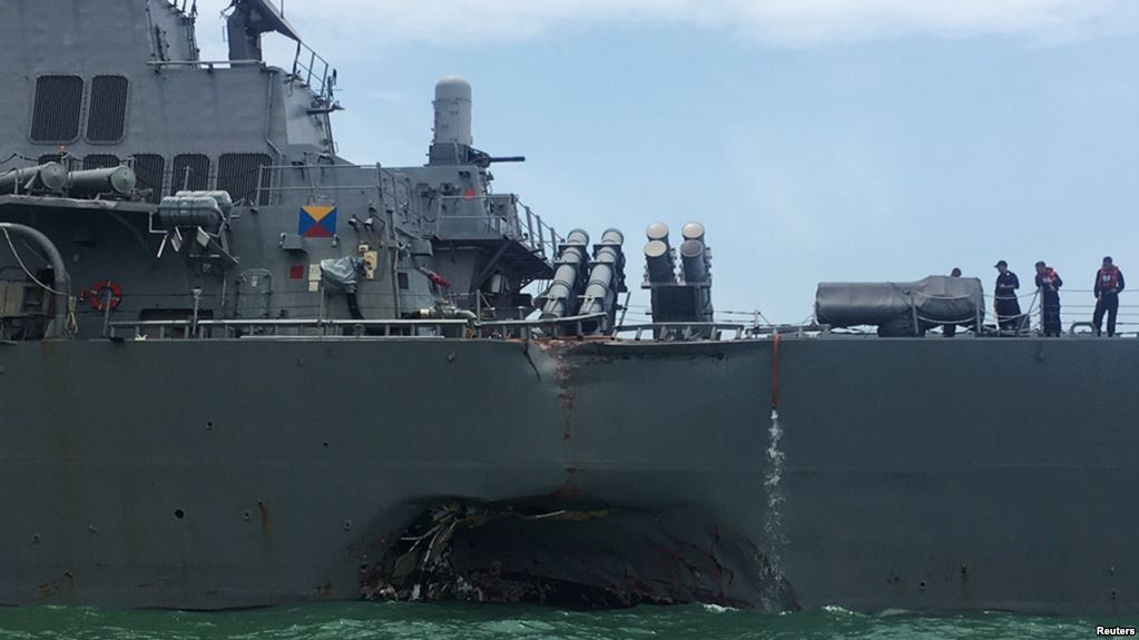 Mười thủy thủ bị mất tích và 5 người bị thương sau khi một tàu khu trục Hoa Kỳ va vào một tàu chở dầu ngoài khơi Singapore rạng sáng ngày 21/8, gây thủng mạn tàu chiến Mỹ và nước tràn vào khoang lưu trú của thủy thủ, theo Hải quân Hoa Kỳ.