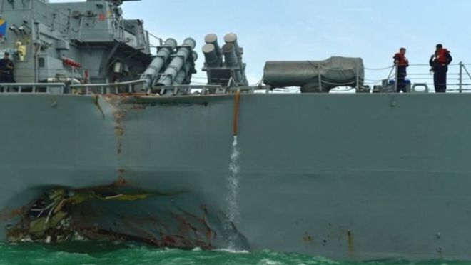 Khu trục hạm USS John McCain hôm thứ Hai 21/8 khi đang chuẩn bị cập cảng ở Singapore thì đâm vào một tàu treo cờ của Liberia, làm 10 thủy thủ mất tích và năm người khác bị thương.