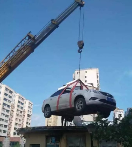 Sau hai giờ, công ty bất động sản quản lý tòa nhà quyết định phải ra tay. Họ thuê một chiếc cần cẩu và đưa chiếc xe lên nóc một tòa nhà và để nguyên tại đó. Khi người phụ nữ ra lấy xe, cô đã vô cùng sửng sốt vì nhìn thấy chiếc xe hơi nằm im trên mái.