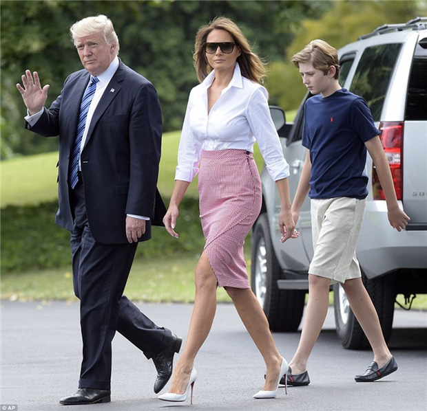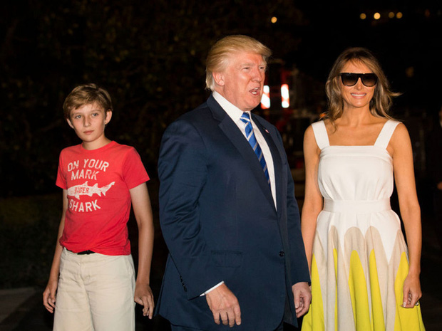 Sau hơn 4 tháng kể từ ngày ông Donald Trump nhậm chức, Đệ nhất Phu nhân cùng con trai đã chuyển tới Washington bắt đầu cuộc sống mới tại Nhà Trắng vào ngày 11/6. Trong lần xuất hiện hiện này, cậu út nhà Trump đã diện một chiếc áo phông bình dân in chữ "The Expert" của hãng J.Crew được bán với giá 29,5 USD (tương đương 672 nghìn đồng).