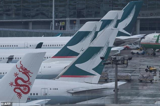 Máy bay xếp hàng chờ bão tan tại sân bay quốc tế Hong Kong. Ảnh: AFP.