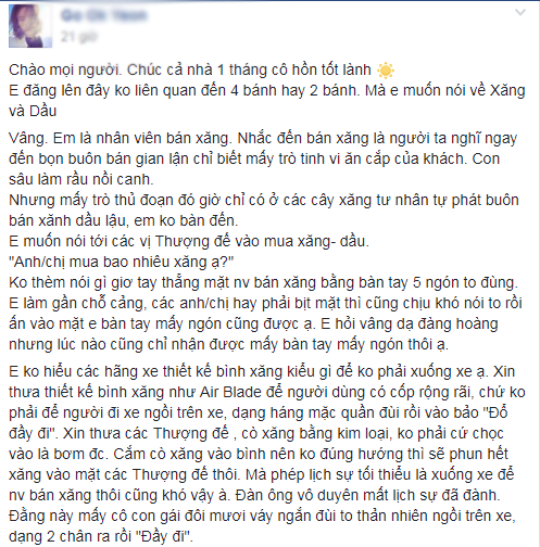 Trong cuộc sống chuyện người bán và người mua luôn là chuyện được bàn tán rất nhiều. Những bức xúc của 2 bên về nhau đều hoàn toàn chính đáng và đúng đắn. Thế nhưng hiện tại sự xúc phạm nhau dù là cố tình hay vô tình cũng đều khiến đối phương tổn thương. Mới đây, một nhân viên cây xăng ở Hải Phòng đã chia sẻ câu chuyện nói về văn hóa đổ xăng của khách hàng thu hút rất nhiều sự chú ý trên các diễn đàn và mạng xã hội.
