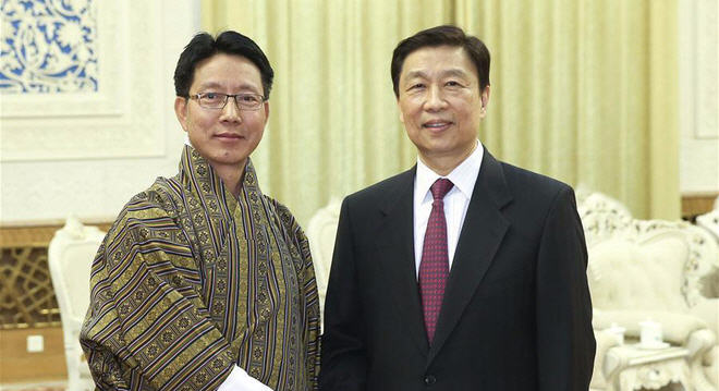 Phó chủ tịch Trung Quốc Lý Nguyên Triều (phải) tiếp Ngoại trưởng Bhutan Damcho Dorji tại Bắc Kinh, khi ông đến Trung Quốc tham gia vòng đàm phán thứ 24 về vấn đề biên giới hai nước, ngày 11/8/2016 (Ảnh: Xinhua/Pang Xinglei)