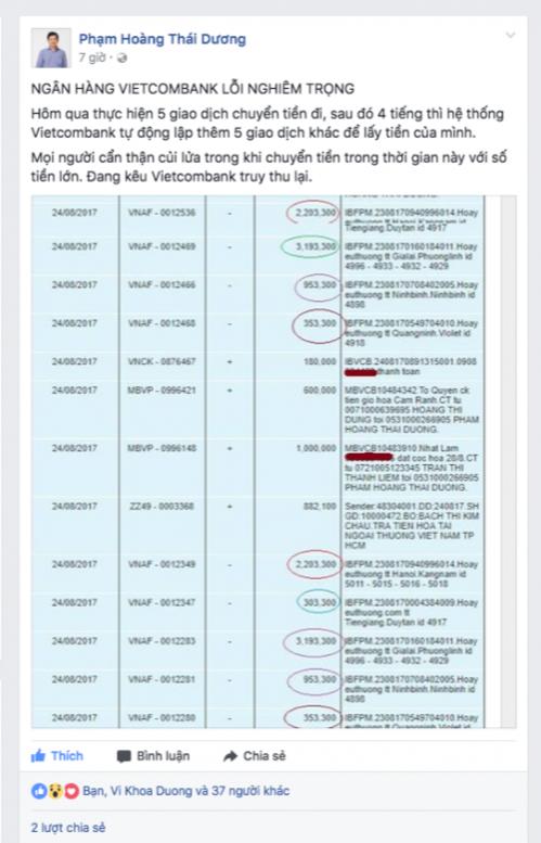 Trong thời gian qua có không ít trường hợp người dùng tài khoản Vietcombank bị trừ tiền mà không thực hiện giao dịch. Mới đây nhất là một khách hàng có tên Phạm Hoàng Thái Dương ở TP HCM đã bị hệ thống Vietcombank tự động thực hiện 5 giao dịch chuyển khoản.