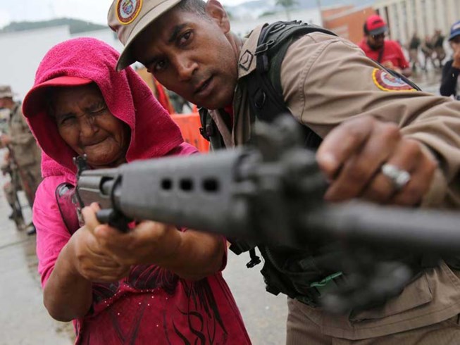 Một binh sĩ của lực lượng dân quân quốc gia Bolivia hướng dẫn cho một phụ nữ cách sử dụng súng trong cuộc tập trận hôm 26-8 tại thủ đô Caracas. Ảnh: REUTERS