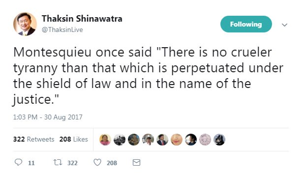 Đây là bài viết đầu tiên của cựu thủ tướng Thaksin trên Twitter kể từ ngày 17-8-2015. Ông bị lật đổ trong cuộc đảo chính năm 2006 và sống lưu vong từ năm 2008 để tránh án tù vì tham nhũng tại Thái Lan.