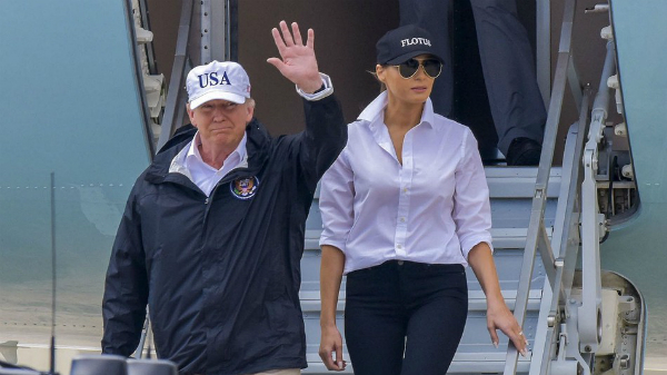 Vợ chồng Tổng thống Trump đến thăm vùng chịu ảnh hưởng của bão với trang phục giản dị, năng động.