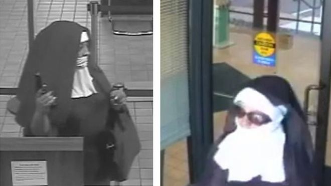 Camera an ninh phát hiện hai phụ nữ ăn mặc như nữ tu để cướp ngân hàng. FBI đang điều tra vụ đột kích này. Điều nực cười là hai nữ tu đã phải ra về tay trắng.