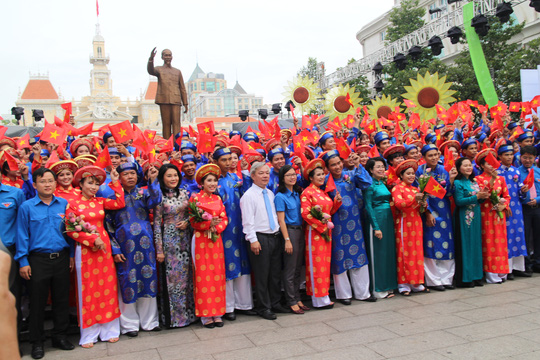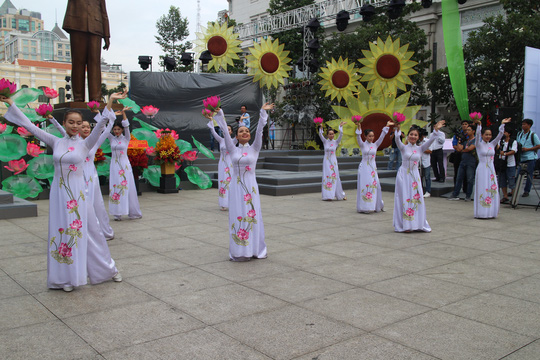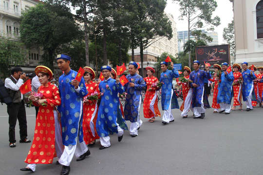 Nhân dịp mừng ngày Quốc khánh 2/9. 100 cặp đôi cô dâu, chú rể mặc trang phục áo dài truyền thống, đội nón lá và đạp xe diễu hành qua các đường phố trung tâm TP HCM. Nhiều người dân Thành phố hào hứng đi xem sự kiện này.