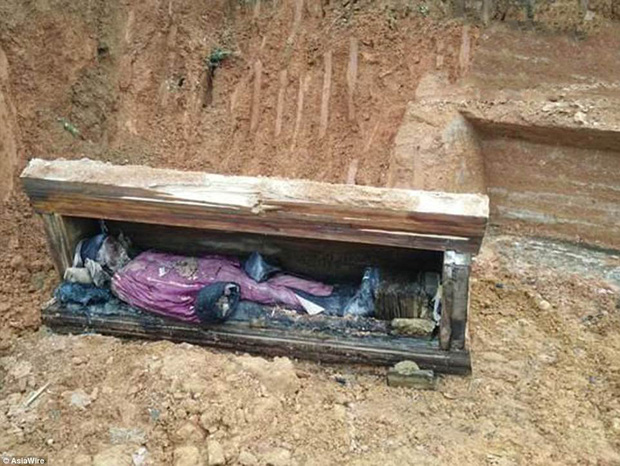 Theo Daily Mail đưa tin, các công nhân xây dựng tại Trung Quốc đã vô cùng bàng hoàng khi phát hiện ra một quan tài hàng trăm năm tuổi, bên trong chứa một xác ướp được bảo quản cực kỳ tốt.