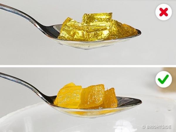 Trái cây khô tự nhiên không có màu sắc sáng, rực rỡ. Cách kiểm tra: Ngâm chúng vào nước ấm. Nếu bị mất màu hoặc hòa tan hoàn toàn, chúng chứa gelatin và hóa chất nhuộm màu thực phẩm.