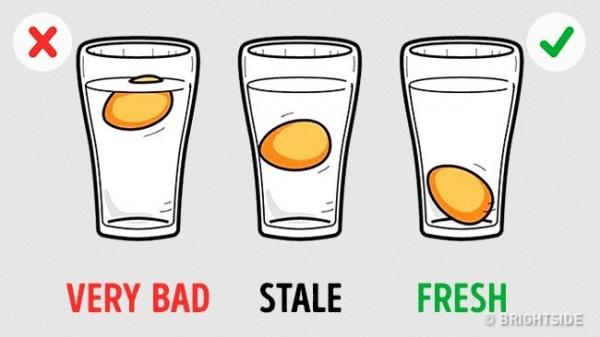 Trứng: Lấy một bình nước lạnh, thả quả trứng vào đó. Trứng chìm xuống đáy theo chiều ngang là tươi, lơ lửng giữa cốc nước là bình thường, có thể sử dụng để nướng bánh. Nếu trứng nổi, bạn nên vứt nó đi.