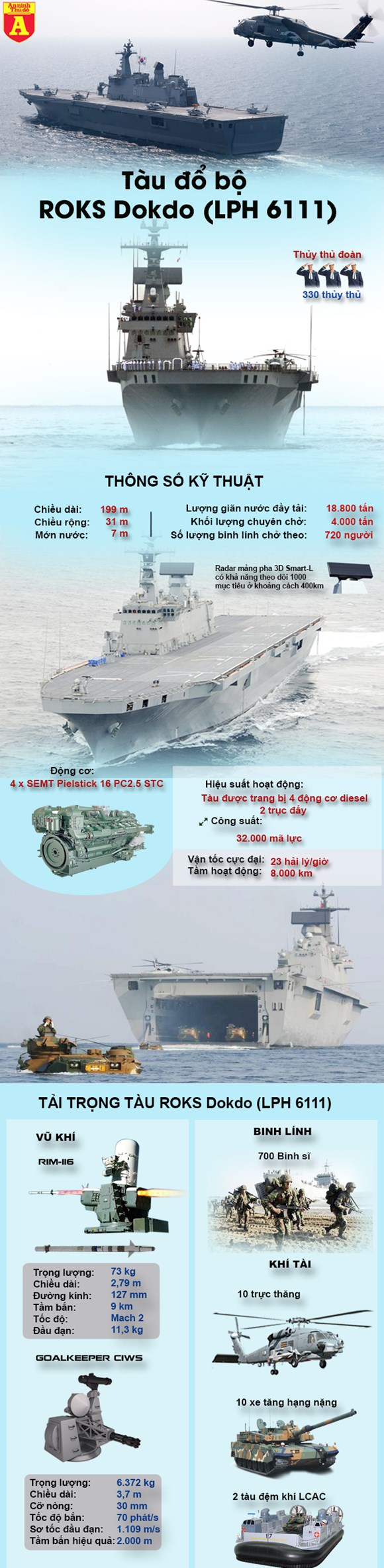 Người ta tin rằng khi cần thiết, tàu đổ bộ ROKS Dokdo (LPH 6111) còn có thể triển khai được cả loại tiêm kích cất hạ cánh thẳng đứng F-35B của Mỹ. Cùng xem thông số chi tiết của tàu qua infographic dưới đây.