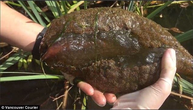 Trong video, vật thể màu xanh lá cây pha nâu sẫm co nhẹ khi bị người kéo lên khỏi mặt nước. Theo các nhà khoa học Canada, sinh vật có kết cấu rắn gần giống như thạch dẻo.