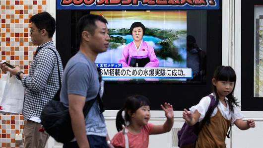 Người dân Nhật Bản đi qua một màn hình chiếu bản tin về vụ thử hạt nhân lần 6 của Triều Tiên ngày 3/9 ở Tokyo (Ảnh: CNBC)