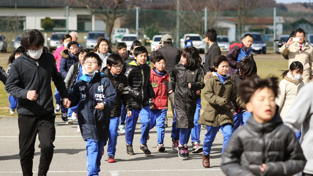 Học sinh tiểu học Nhật Bản học kỹ năng sơ tán trong trường hợp khẩn cấp (Ảnh: Kyodo)