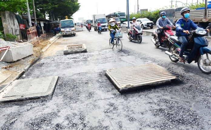 Nắp cống bằng thép bóng loáng, trơn trượt, lồi lên trũng xuống dọc ngang trên nhiều con đường, có nhiều nơi “hội tụ” nhiều đến nỗi trông mặt đường như chiếc áo vá, tả tơi luôn tiềm ẩm rủi ro với người đi đường ở Sài Gòn.