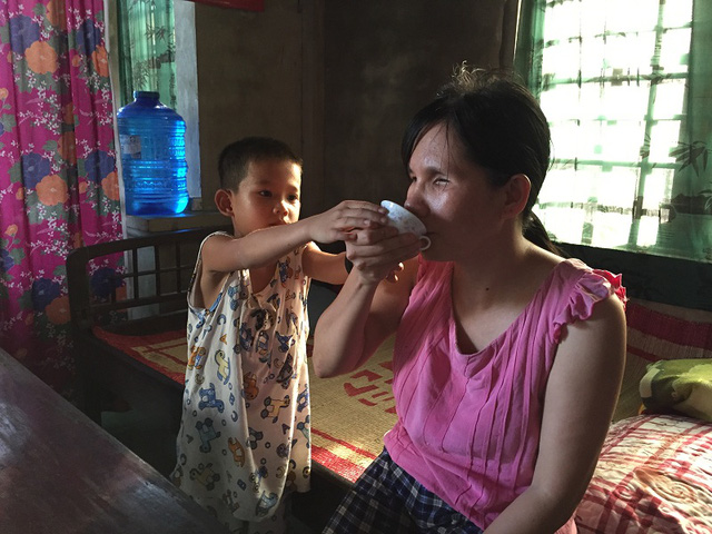 “Mình đã khổ, đã khiếm khuyết, giờ còn con nhỏ nữa không biết rồi nuôi cháu như răng nữa. Hai mẹ con sống nhờ vào ông ngoại và cậu. Còn ông thì Trung Nguyên còn được đi học, giờ ông mất rồi chẳng ai lo cho nữa. Cậu thì sức yếu, lại bị thương tật ở tay không làm được việc nặng, công việc chăn vịt thuê của cậu cũng chỉ đủ cho hai anh em và cháu rau cháo qua ngày”, chị Dương buồn tủi.