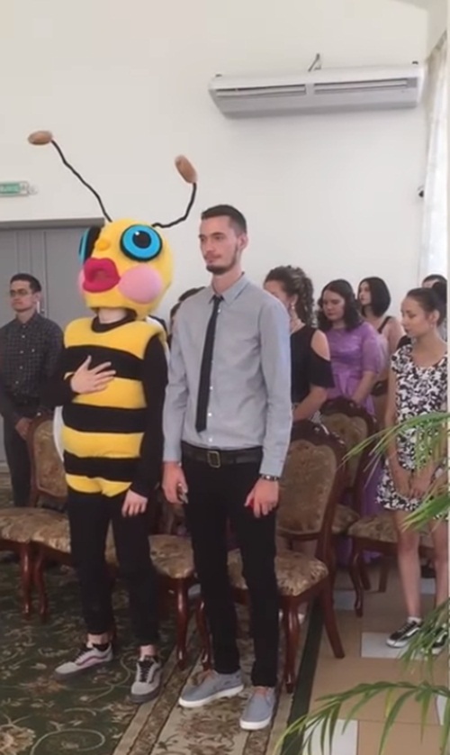 Đúng hẹn, bạn trai cũ của cô có mặt tại hôn lễ. Tuy nhiên, anh chàng không xuất hiện bảnh bao trong bộ comple tươm tất cùng với xe sang hay một cô bạn gái mới nóng bỏng đi kèm. Anh xuất hiện trong bộ đồ của một con ong chúa khổng lồ rất ngộ nghĩnh.