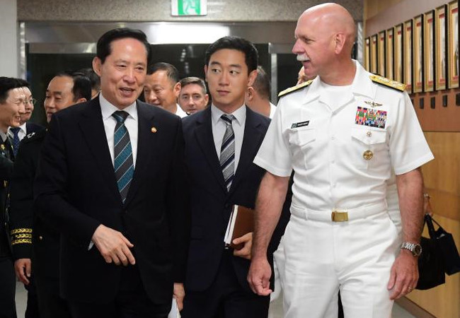 Tư lệnh Hạm đội Thái Bình Dương Scott Swift và Bộ trưởng Quốc phòng Hàn Quốc Song Young-moon (trái). Ảnh: The Investor.