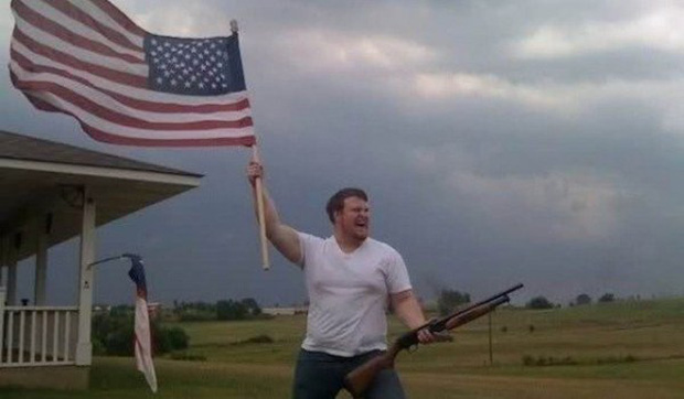 Một cư dân mạng đang cổ động phong trào bắn bão bằng cờ Mỹ và súng ống.