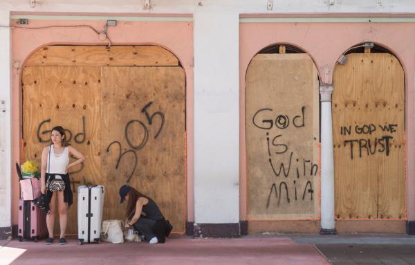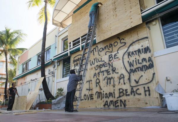 Theo ước tính, Florida sẽ thiệt hại hàng trăm tỷ USD do cơn bão. Trong ảnh, một cửa hàng được gia cố phần cửa với những tấm gỗ ghi dòng chữ "Đừng mở ra, mở ra sẽ chết. Irma hãy đi đi".