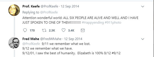 Mỗi năm cứ đến dịp tưởng niệm vụ khủng bố 11/9, Elizabeth lại đăng tải bức hình lên mạng xã hội, hy vọng nhờ sức mạnh của truyền thông, sẽ có ai đó nhận ra được những người trong bức ảnh để nó sớm được trở về "nhà".