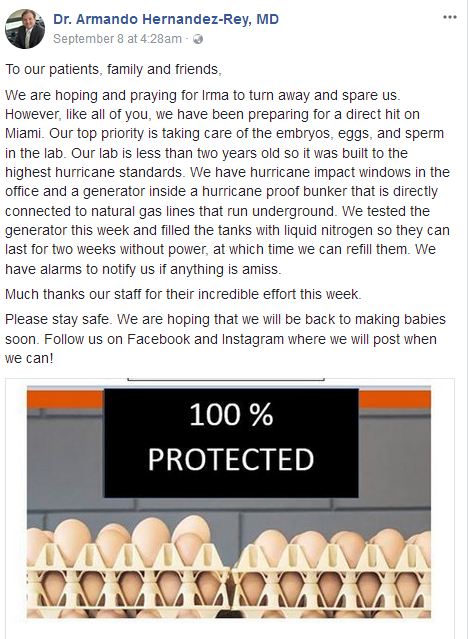 Sau khi thị trưởng thành phố Miami mở rộng lệnh sơ tán vào hôm thứ 5 tuần trước, tất cả mọi người cố gắng di chuyển một cách nhanh nhất để bảo vệ tính mạng và những tài sản thiết yếu của ḿnh. Trong khi đó, vị bác sĩ 46 tuổi này đă dành ra hàng giờ đồng hồ để kiểm tra tất cả trứng, tinh trùng và phôi thai tại cơ sở của ḿnh, đảm bảo chúng được an toàn khi siêu băo Irma càn quét qua.