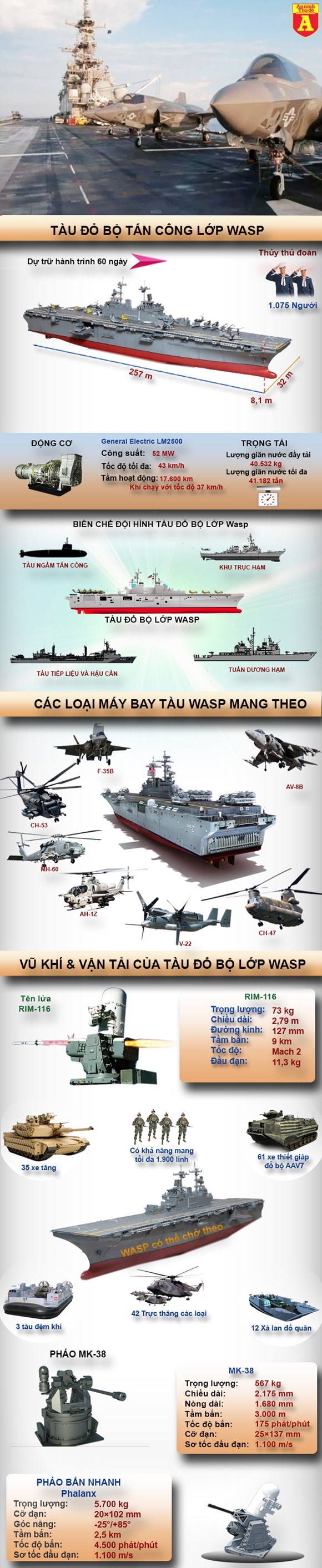 Vietbf.com - Mỹ đă quyết định điều tàu đổ bộ tấn công lớp Wasp tới bán đảo Triều Tiên, sau khi B́nh Nhưỡng thử hạt nhân thành công, v́ tàu đốc đổ bộ chở trực thăng LHD (Landing Helicopter Dock) lớp Wasp được Hải quân Mỹ thiết kế dựa trên cơ sở tàu đổ bộ tấn công Tarawa thế hệ trước với nhiều cải tiến để tăng khả năng hoạt động của máy bay cũng như năng lực chuyên chở.