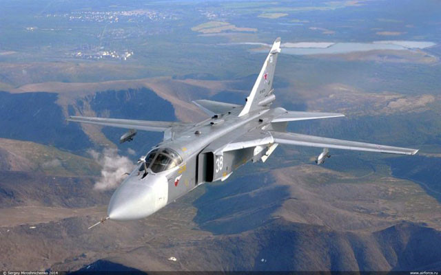 Máy bay ném bom chiến thuật có cánh h́nh học thay đổi Su-24M/Su-24M2 (NATO gọi là Fencer). Chữ “M” có nghĩa là hiện đại hóa. Các máy bay cũ nhất trong các máy bay này được chế tạo vào năm 1988-89. Su-24 được đưa vào trang bị vào năm 1983, tốc độ tối đa 1.600km/h, tầm bay với tải trọng đầy đủ 560 km, trần bay thực tế 17 km. Vũ khí trang bị: pháo ṇng quay 6 ṇng 23 mm với 550 viên đạn, 8 điểm treo mang được 7.500 kg bom đạn (tên lửa không đối không, tên lửa không đối đất, rocket, bom có điều khiển KAB-500, bom không điều khiển FAB-1500, FAB-500, FAB-250, các thùng treo nhỏ, các thùng treo chỉ thị mục tiêu. Hiện tại, có thể có tới 12 máy bay này được triển khai tại Hmeimim.