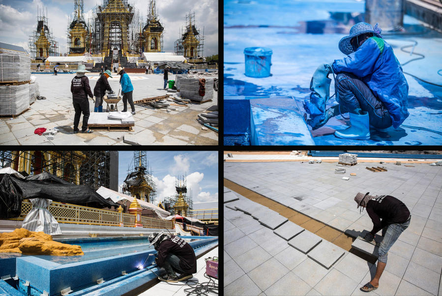 Bên ngoài Sanam Luang, việc thi công diễn ra khẩn trương - Ảnh: Bloomberg