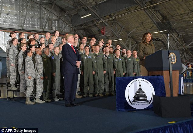 Sau khi thăm các em nhỏ, bà Trump cùng chồng đến khu vực tập kết máy bay tại căn cứ không quân để giao lưu với các sĩ quan quân đội ở đây. (Ảnh: AFP/Getty)