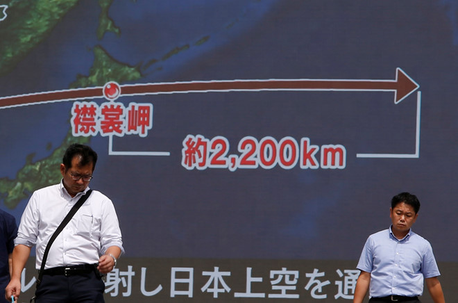 Tên lửa do Triều Tiên phóng hôm 15/9 đã bay quãng đường 3.700 km, rơi xuống Thái Bình Dương ở vị trí cách đảo Hokkaido của Nhật 2.200 km. Ảnh: Reuters.